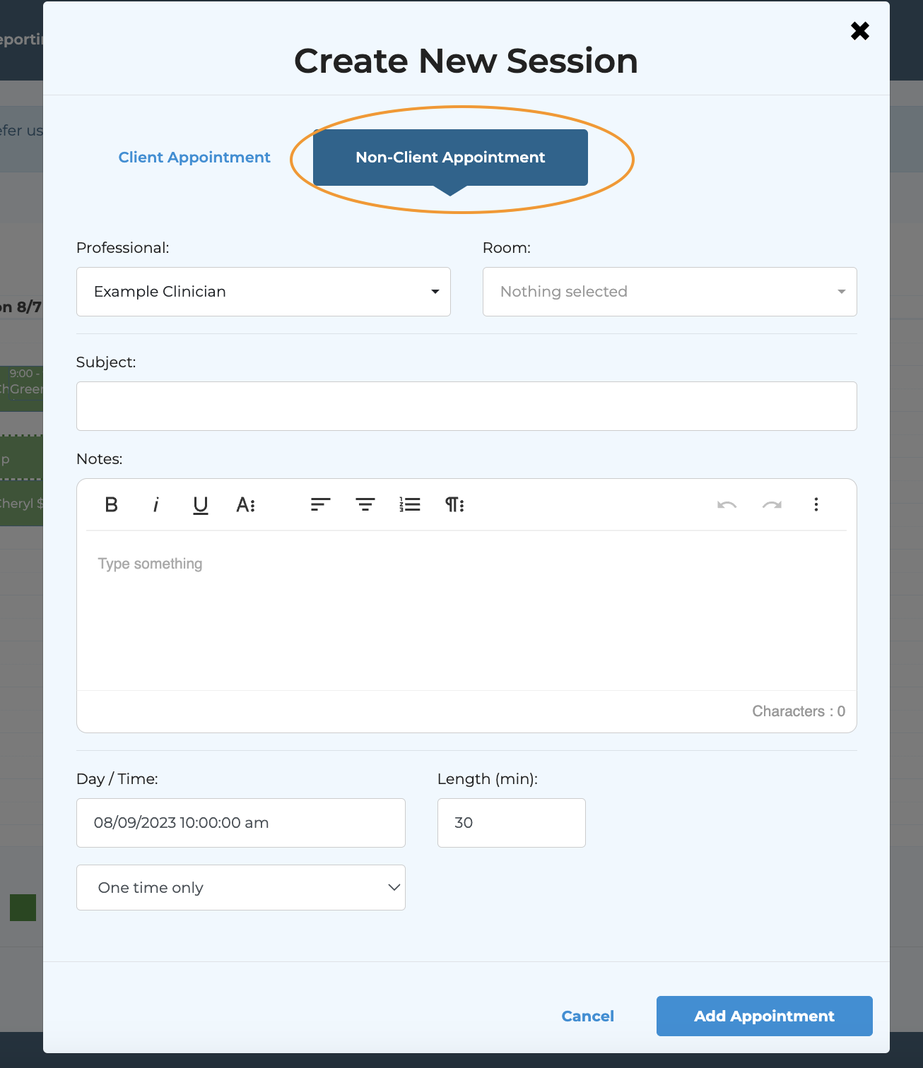 Step 1: Click on the "Non-Client Appointment Tab" at the top of the Create Session pop-up screen.