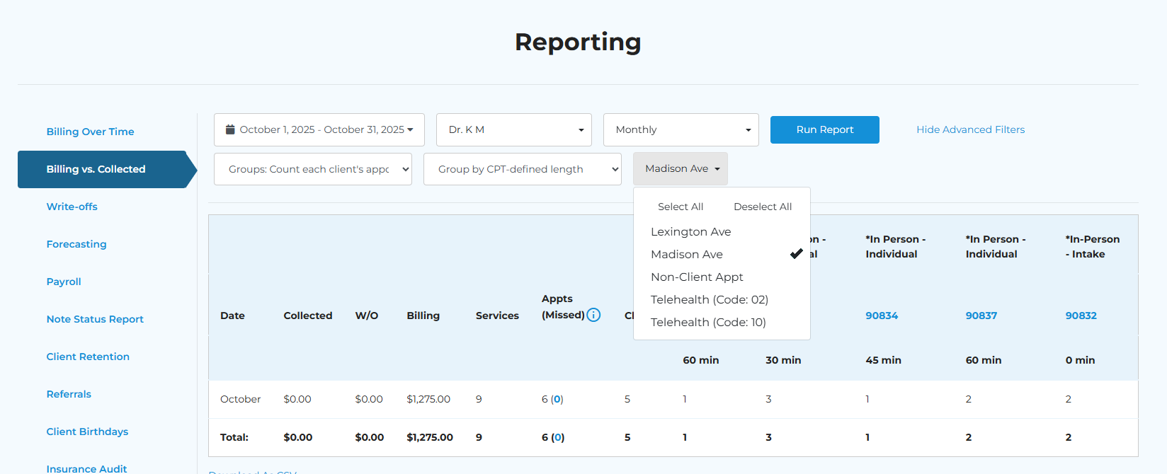 Now, professionals can filter by facility when running the billed vs. collected report.