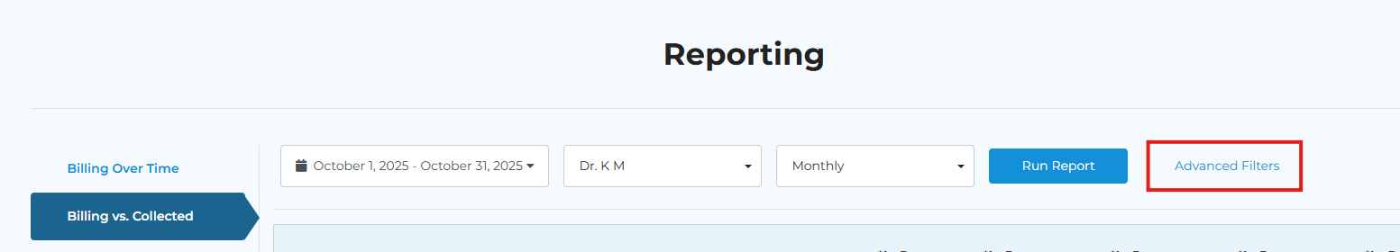 STEP 1: Click on the Reporting tab in the navigation bar and click on the Billing vs. Collected tab on the right-hand side. STEP 2: Select the desired parameters for your billing vs. collected report. Date Range Clinicians Type of Report STEP 3: ...