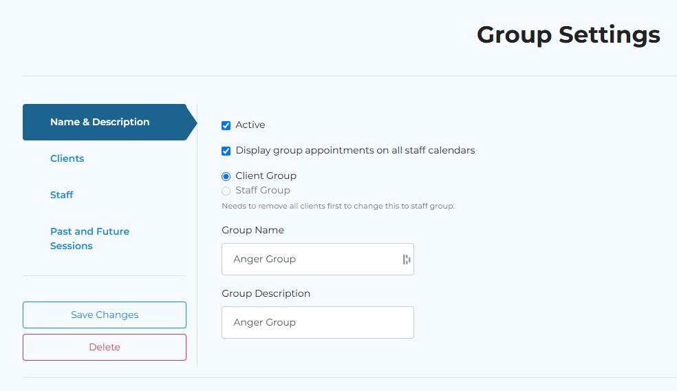 - Group Name→ This will be the name that staff see when viewing the list of existing treatment groups and when scheduling group sessions.