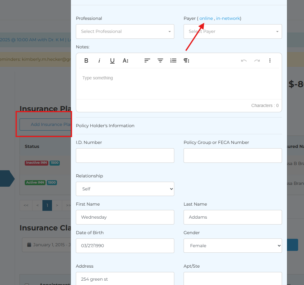 Once the offline payers have been added to your claim center, you can navigate to the client chart Claim Center tab to add their offline insurance details.