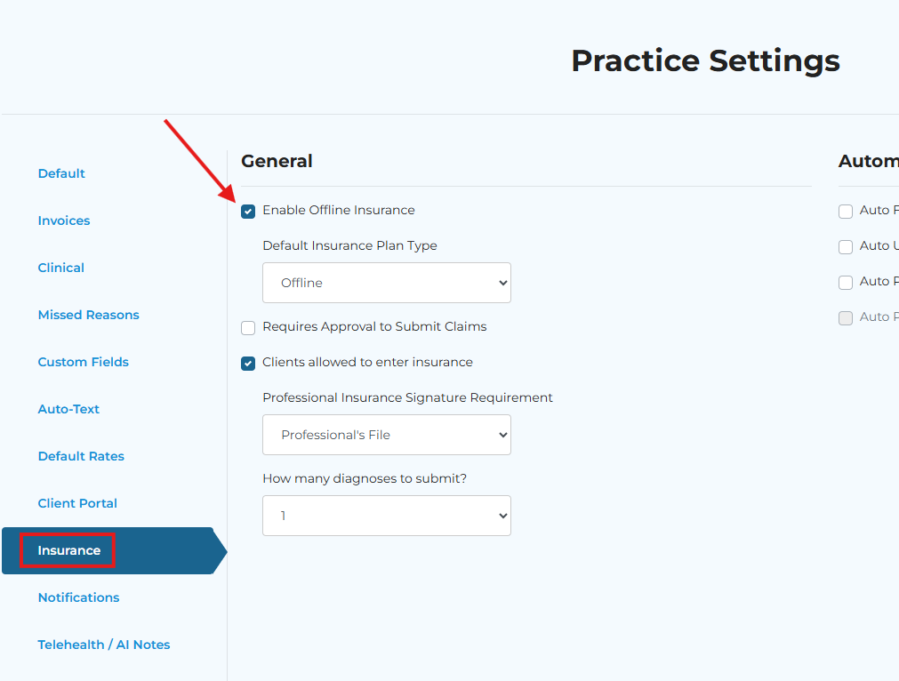 Enabling Insurance: Within the Practice Settings, locate the Insurance tab. Here, you have the ability to enable offline claims by selecting 'Enable Offline Insurance'. Once this is enabled, the offline claims tab will become visible within your claim center.