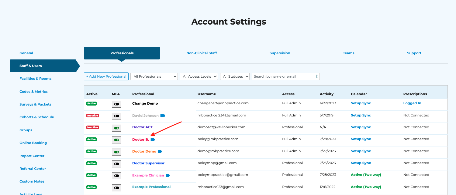 Step 1: Navigate to the professional user's settings by clicking on their name in the Staff & Users list.