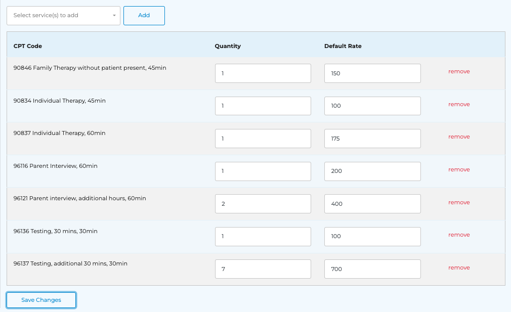 Step 4: Enter the default quantity (number of units) and the default rate (amount billed) for each CPT code, and press Save Changes.