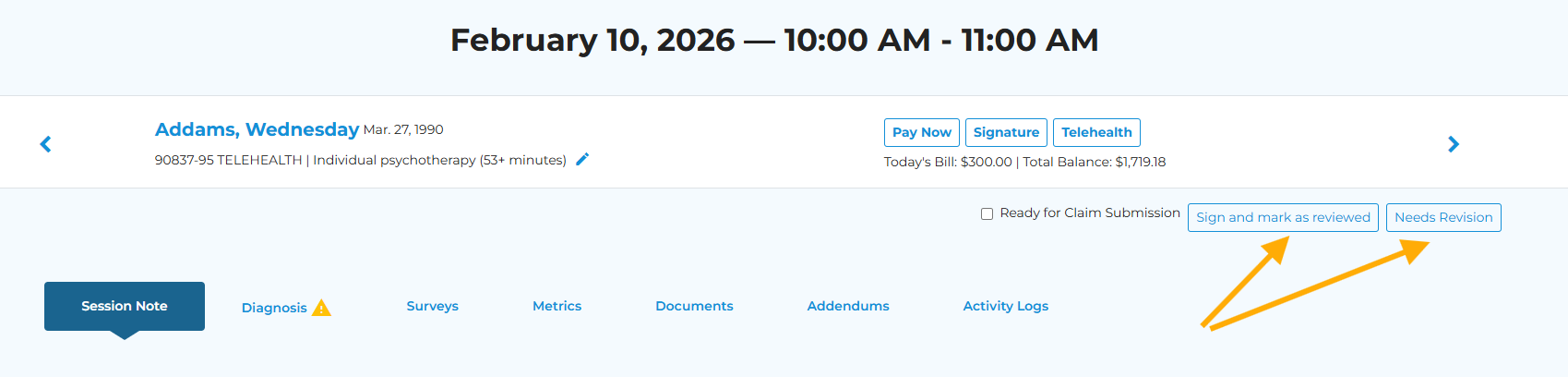 Once you have reviewed the appointment note, you can choose "Sign and mark as reviewed" or 'Needs Revision' button in the top right-hand corner.