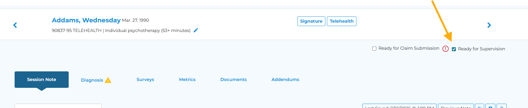 Once you have finished writing a note for a client appointment, check "Ready for Supervision". Now, the note will be added to your supervisor's To-Do List, so they can review/sign the note.