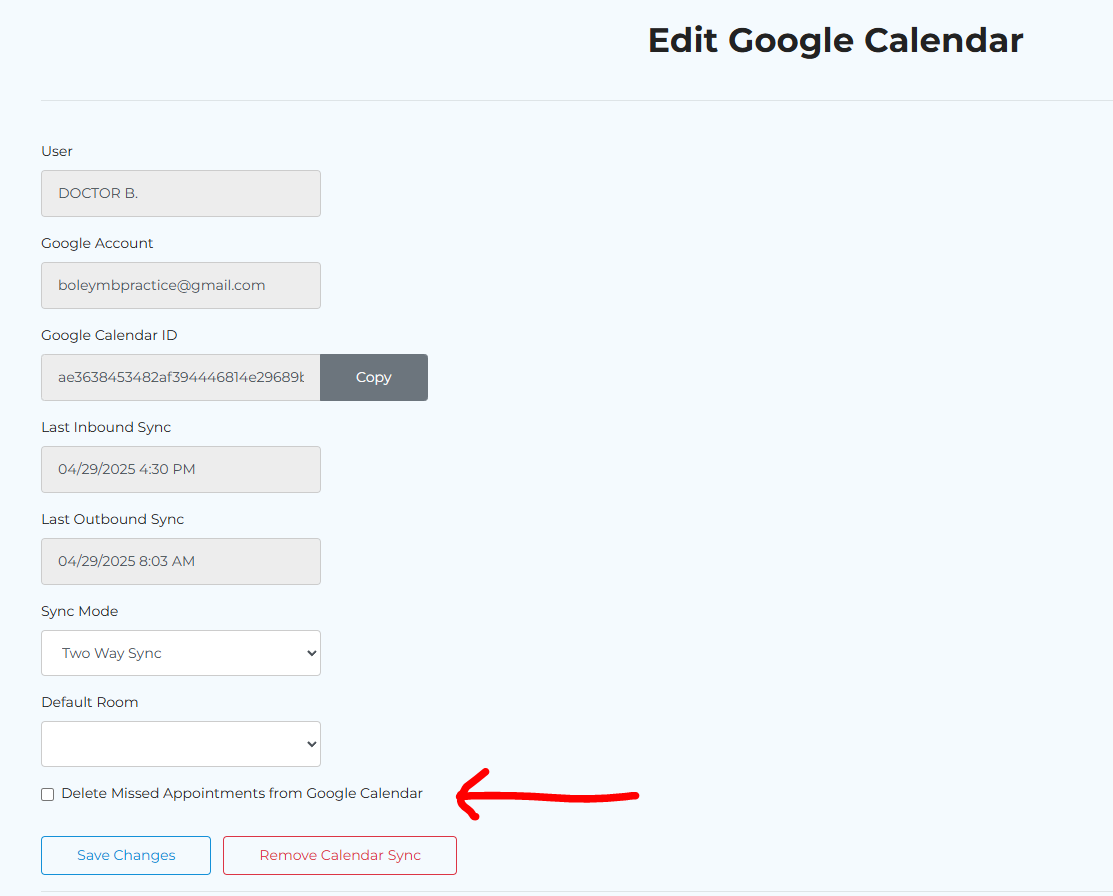 This will display all of the appointments entered into your calendar within MBP on your Google Calendar. However, you will not be able to edit or delete them within Google. All changes must be made within the calendar in your MBP account.